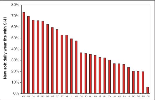 Soft lenses dominated most markets and accounted for more than 90 percent of new fits in 22 of the 28 markets assessed (Table 4). For the first time, silicone hydrogels were the most widely fitted soft lens materials of the four available categories in this work, accounting for 39 percent of new soft lens fits. In the United States and Kuwait, silicone hydrogel materials were prescribed for more than 70 percent of fits (Figure 2). In contrast, only 6 percent of fits in China were with silicone hydrogels.