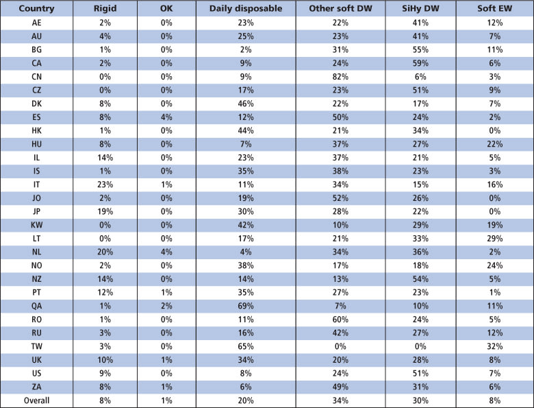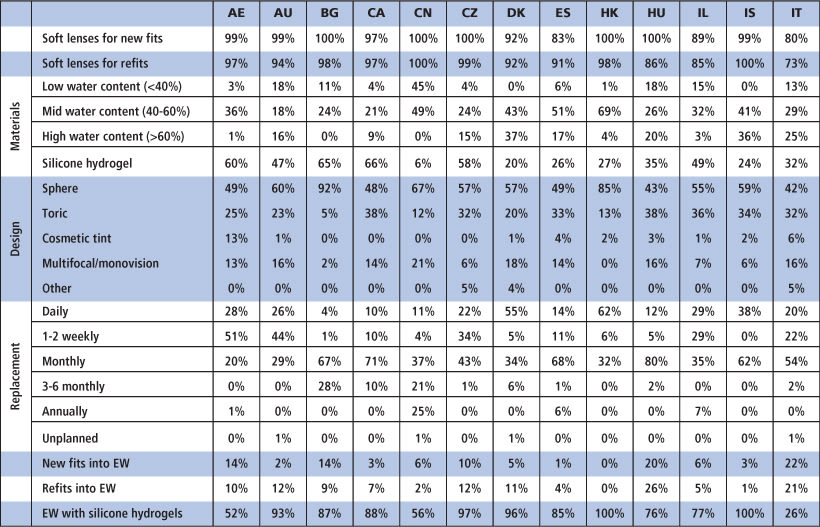Table 4. Detailed information for prescribed soft lenses. See Table 1 for country abbreviations. EW = extended wear.