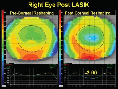 We ultimately dispensed the following CRT lenses: OD 9.5 0.525 −32 and OS 9.4 0.525 −32 for overnight wear. Within five days the patient was elated with his 20/20 uncorrected visual acuity, which was stable throughout his waking hours (Figures 2 and 3). While CRT post-LASIK remains an off-label use, it might be a modality to consider for certain selected patients. CLS
