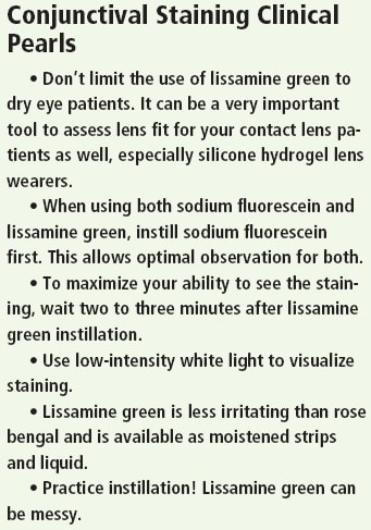 Adding lissamine green conjunctival staining to a lens evaluation can shed light on lens fit and ocular health.