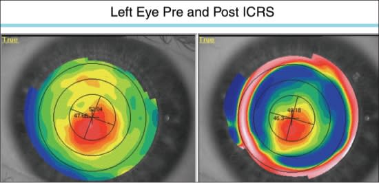 Figure 1. Topography of a keratoconus patient before and after undergoing intracorneal ring segment surgery. PHOTOS COURTESY OF MICHAEL A. WARD, MMSC, FAAO