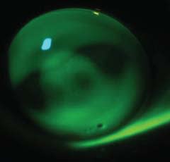 Figure 1. Sodium fluorescein pattern of an Art Optical AKS lens on an extremely steep keratoconic cornea (base curve of 69.50D/4.86mm). There is a three point touch pattern with a dense midperipheral pattern. The lens did not dislodge and provided 20/25 vision.