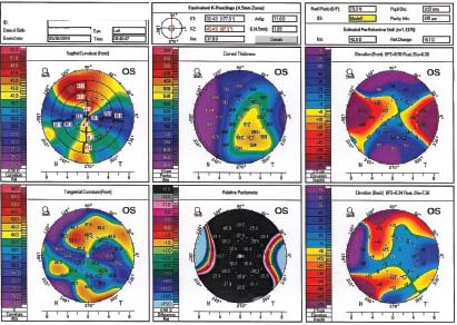 Figure 5. Topography of a patient who has severe Salzmann's Nodular Degeneration. This highly irregular toric shape was most amenable to a bitoric GP piggyback fit. Vision was 20/25, but end-of-day comfort was a chronic problem for this patient.
