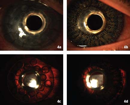 Figure 4a. Color anterior segment photograph of Boston KPro keratoprosthesis. 4b. Color anterior segment photograph of pupil-control prosthetic contact lens (Ciba Vision D3 ColorBlends blue with 6mm black underprint). 4c. Retroillumination of naked Boston KPro. 4d. Retroillumination of Boston KPro with pupil control contact lens.