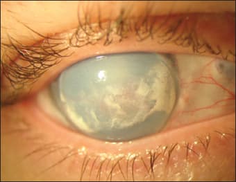 This photograph shows the right eye of a 41-year-old female patient who has band keratopathy. She reported previous trauma to her eye at the age of 3. The patient complained of longstanding irritation and discomfort in her right eye. She was using a beta blocker once daily OD and also GenTeal (Novartis) q.i.d. OD. Her right eye measured light perception vision.