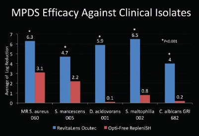 Figure 1. RevitaLens Ocutec offered superior antimicrobial efficacy against resistant clinical isolates and microbes commonly found in contact lens cases.