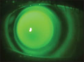When an off-the-shelf lens is inadequate, the Flexlens Piggyback (X-Cel Contacts) in Definitive (Contamac) material is an excellent option to center the GP lens. The Pillow Lens (Fusion) can provide a more stable piggyback system where the GP is held within the recess of the Pillow (Figure 1).