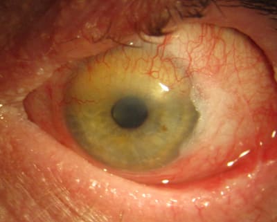 Figure 1 shows the right eye of a 54-year-old man with Stevens-Johnson syndrome (see Figure 2 for the left eye). His symptoms started at age 10. His best-corrected visual acuity is count fingers for the right eye and 20/40 for the left eye. He currently uses combination tobramycin and dexamethasone (Tobradex, Alcon Laboratories Inc.) twice per week in both eyes, ciprofloxacin (Ciloxan, Alcon Laboratories Inc.) twice per week in both eyes, loteprednol (Lotemax, Bausch + Lomb) every day in both eyes, and Refresh Tears (Allergan Inc.) in both eyes as needed. The patient has had surgeries to correct symblepharon and trichiasis. He has successfully worn scleral contact lenses for 5 years.