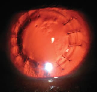 For a PK, the corneal surgeon uses a trephine to cut a full-thickness section from the recipient's cornea and then replaces it with donor tissue from a cadaver eye that has been screened for pathology and has a healthy endothelial cell count. Occasionally, smaller grafts are used as a patch in the case of corneal perforation (Figure 2). The graft is secured with a series of interrupted or running sutures. The patient is immediately put on short-term antibiotic drops to prevent infection and is put on long-term topical steroid drops to prevent rejection. Oral antivirals are given pre- and post-operatively if the patient has a history of herpes simplex to avoid reactivation of the virus. Visual recovery is slow and may take between six and 12 months. The sutures are often left in place indefinitely unless removed secondary to becoming loose or in an attempt to help correct for postoperative astigmatism. PK may be combined with cataract surgery if the patient has visually significant crystalline lens opacities. Unfortunately, in a combined procedure, postoperative refractive outcomes are difficult to predict secondary to the possibility of induced astigmatism from the PK procedure.