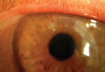 There is debate about when a patient is able to safely wear a contact lens after a PK. The answer depends on many factors for each patient, but generally speaking, most patients are able to be fit with a contact lens between six and 12 months after their surgery as long as they are without complications, their refractive error is stable, and the surgeon gives consent. Patients with corneal grafts who wear contact lenses need to be monitored carefully for secondary lens complications. Of primary concern is the development of lens-induced neovascularization, particularly stromal, which increases the risk of corneal graft rejection (Kaufman et al, 1998). Using high-Dk lens materials will reduce this hypoxic complication, but a lens that irritates a suture site (Figure 4) may also evoke unwanted vessel formation.