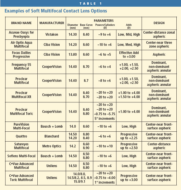 I have found that the lens designs can be biased. For example, because you can put the distance power in the center of both eyes when using the Proclear Multifocal (CooperVision) or Frequency 55 Multifocal (CooperVision), you can bias that system for distance easily. The PureVision Multi-Focal lens (Bausch + Lomb [B+L]) can be biased at near because of the design of the “High” add. The Acuvue Oasys for Presbyopia (Vistakon) and the Air Optix Aqua Multifocal (Ciba) lenses are often successful in the middle of these two extremes.