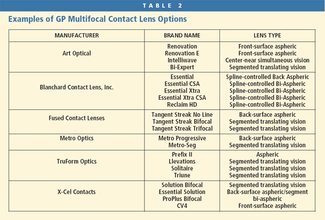 The more lens options that we have at our disposal the better, and we have never had more options—both soft and GP (Tables 1 and 2). During the last few years, the industry had created many new lens designs that have greatly enabled us to help more patients than ever before.