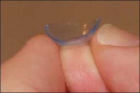 Prior to soft lens application, the correct orientation of the lens must be confirmed. In the early years of soft lens designs, particularly when lenses were relatively thick, patients were simply instructed to place the lens on the tip of their index or middle finger to assess the profile of the lens edge (Figure 1). A lens that was facing the correct way would have the appearance of a “bowl,” while the edges of an everted or inverted lens had a tendency to turn outwards slightly, resembling a “dish.” If patients were uncertain, they could “pinch” the lens slightly (Figure 2). If the lens edge tended to turn inward, then the lens was facing the correct way, and if the edges turned out toward the fingers, then the lens was everted.