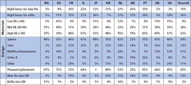 High-Dk lenses (>90 units) are the rigid lens of choice overall, accounting for 62 percent of fits. Most rigid lenses (65 percent) are prescribed on a planned replacement modality (usually annually); a significant amount of extended wear prescribing was reported for New Zealand and Portugal, mainly due to the popularity of orthokeratology outlined above.