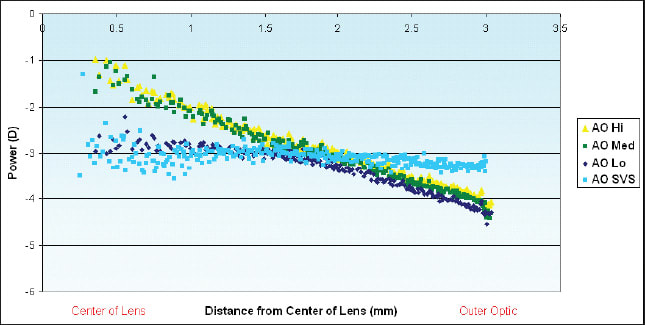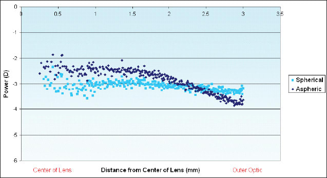 Figure 1. Power profiles of −3.00D spherical and aspheric lenses.
