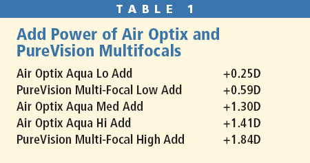Our analysis of power profiles of the Air Optix Aqua multifocal lenses showed that there are effectively just two distinct designs. The power profile for the Lo Add estimated the add to be 0.25D. With an add of this magnitude, practitioners may find a need to adjust the distance power to increase the effective add. With the Med Add and Hi Add lenses having similar adds, practitioners may find limited use for the Med Add as the patient requires a greater add need.