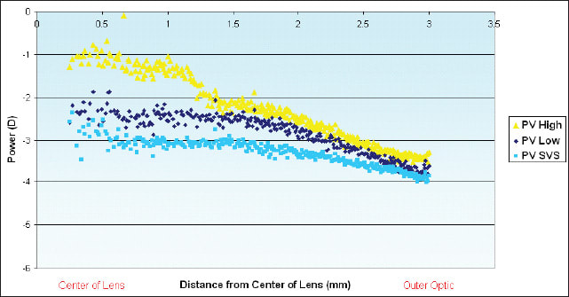 Similar Hartmann-Shack wavefront measurements were gathered for PureVision Multi-Focal and PureVision single vision aspheric lenses. Figure 3 illustrates the power profiles of the PureVision Multi-Focal Low and High Add center-near aspheric design lenses, as well as the PureVision single vision aspheric lens. Mean lens powers over the central 2mm diameter for the PureVision Multi-Focal Low Add and PureVision Multi-Focal High Add were −2.41D and −1.16D, respectively. With a difference in central powers of 1.25D (95 percent CI: 1.18D, 1.31D), the power profiles revealed two distinct design profiles. The mean power in the central portion of the single vision lens was −2.97D, with a difference in means between the single vision lens and the Low Add PureVision lens of 0.56D (95 percent CI: 0.50D, 0.64D).