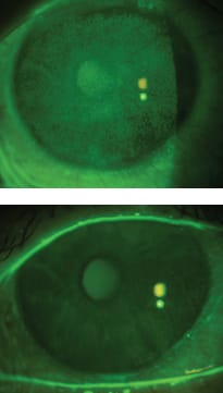 Entering visual acuity with spectacles was 20/25 OD and 20/40 OS. Figure 3 shows the appearance of his corneal staining. The corneal staining of each eye appears fairly similar despite his left eye being more symptomatic. As in the last example, there were no significant anatomical obstacles that challenged the design. The goals for fitting this patient were to improve the ocular comfort and also to improve visual acuity. The patient observed immediate relief upon application of both diagnostic devices.