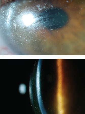 Figure 5. The first image shows diffuse front-surface debris in a patient who has keratoconjunctivitis sicca. The second image shows an example of debris in the reservoir of the device. Finding the path or pattern of debris provides an opportunity to improve the alignment of the device to the sclera.