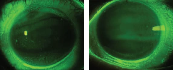 This patient began wearing 18.0mm devices in the beginning of the fitting process. As mentioned before, some patients are aware of the tissue that is not covered by the lens. He was successfully trained with application and removal of the 18.0mm spherical devices (540µm sagittal depth), but he complained of symptoms of wind and exposure outside of the area of the lens. His complaint warranted a trial with a larger, 20mm diameter device. He observed an improvement with this trial. The change in the diameter was essentially like starting over, but ultimately it was beneficial. His final correction OD was an against-the-rule (ATR), back-surface toric, 20.0mm overall diameter lens, 620µm sagittal depth from the flat meridian and 250µm difference between the flat and steep edge. The left lens was a 20.5mm overall diameter, ATR, back-surface toric design with 645µm of sagittal depth from the flat meridian and 250µm of toricity.