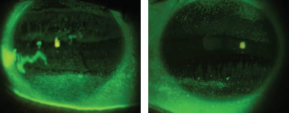 Figure 3. Pre-fitting photos of corneal staining OD and OS for Patient #2 who suffers from cGVHD.