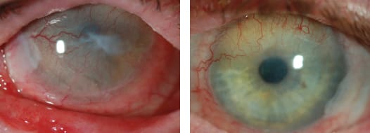 Figure 6. Patient #3, who has a history of SJS from more than 30 years ago. OD demonstrates diffuse pannus across the cornea with a paracentral anterior fibrotic scar (left photo). Superior pannus that spares the pupil OS appears in the right photo.