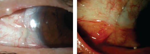 Figure 7. Patient #4 had an advancing temporal symblepharon that required a notch to accommodate in the left photo. The right photo shows that after symblepharon lysis, the tissue is avascular where the symblepharon once was, but a new symblepharon formed.