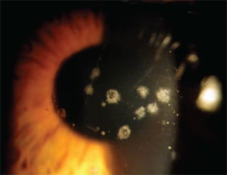 This photo shows the left cornea of a 27-year-old male who reported as a new patient for contact lens fitting. He reported no ocular or visual complaints. Other than myopia, the patient stated not having any other known ocular diagnosis or pertinent family ocular history. His best-correct visual acuity was 20/20 in both eyes. Slit lamp exam of the patient's right (Figure 2) and left corneas showed small white central opacities in the anterior stoma with clear intervening space. The patient was diagnosed with granular corneal dystrophy.