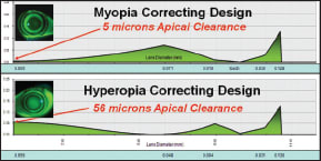 Figure 2. (Top) Tear film profile of a myopic corneal reshaping lens design. (Bottom) A hyperopic reshaping lens.