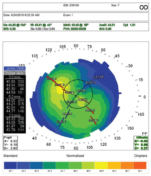Her examination findings were refraction OD −9.75 −1.25 x 050, 20/20, add +2.50 J1 and OS −11.00 −1.75 x 145, 20/20, add +2.50 J1. Keratometry readings from topography (Figures 5 and 6) were OD 44.50/43.00 @ 44; OS 45.13/43.89 @ 146.