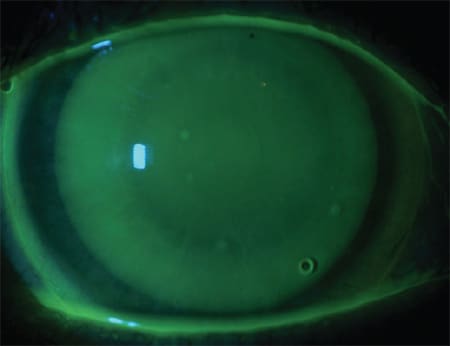 At the dispensing appointment, we applied the lenses and allowed them to settle. After settling, fluorescein was instilled into each eye and was allowed to circulate under the lenses. The fit was acceptable and the comfort was good (Figures 1 and 2). Distance vision was measured at 20/20 OD and 20/25 OS, with near vision at 20/25 OD and OS. The patient reported the comfort to be excellent with no real lens awareness. We dispensed the lenses with instruction for application, removal, care, and handling. She returned for a subsequent follow-up visit at which time she reported improved vision and no issues.