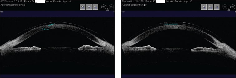 Figures 15 and 16. Optical coherence tomography images of the lenses in Case 5. The images demonstrate the alignment of the lenses with the smallest amount of clearance between the lens and the cornea.