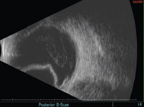 Figure 1. B scan of Marfan’s patient with retinal detachment and posteriorly dislocated lens.