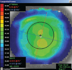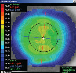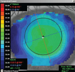 Two months later, the patient returned to the clinic with a complaint about blurred vision through his glasses following end-of-day lens removal. However, the patient did not have any visual complaints while wearing the Duette lenses. Entering visual acuities with the lenses were 20/15– OD and 20/15 OS. We removed the lenses and performed manifest refraction. For the right eye the manifest refraction was now –6.25 –0.50 x 155 and for the left eye it was –6.50DS, which achieved a best-corrected acuity of 20/15 OD and OS. Taking the previous manifest refraction and comparing spherical equivalents to that day's end point revealed a –0.50D OD and –0.75D OS myopic shift in refractive error over the two months. Figures 3 and 4 show the topography results from that visit.
