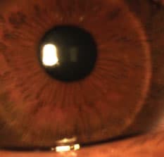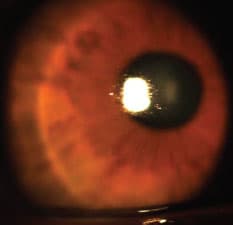 Central simulated K values were similar to pre-lens values at this visit, but a clear ring of midperipheral flattening was evident on each ocular surface. The pattern was the opposite of what you would expect to see with a myopic orthokeratology treatment. Moving the measuring curser to the midperipheral area in question in both the initial topography maps and the new topography maps showed approximately 4.00D of flattening. With the lenses removed, Figures 5 and 6 show clear corneal impression rings on each eye.