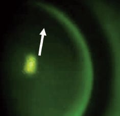 Figure 8. Fluorescein pattern of the left lens at the two-month visit. Although more fluorescein was present peripherally, there is evidence of slight bearing (arrow).