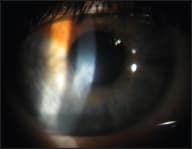 Initial treatment consisted of a systemic diuretic to drain fluids from the cornea as well as from the rest of the body; a steroid-antibiotic combination drug to reduce inflammation and to protect from infection; and a prostamide to reduce intraocular pressure, thus producing a negative anterior chamber gradient to reduce fluid movement across the endothelium and Descemet's membrane into the stroma. Figure 2 shows the hydrops scar.
