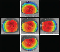 Data collection begins by first obtaining a traditional central topographical map on a patient's line-of-sight. The patient is then instructed to look five rings up, down, left, and right (Figure 1). The five topographical maps are highlighted (Figures 2 and 3), and immediately the composite map is generated and displayed. Figure 4 shows the traditional capture of the Medmont topographer, measuring a cord 9.6mm, and the new composite map display with a measuring cord of 11.7mm.