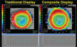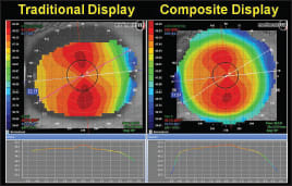 Figure 5 shows the traditional display and the composite display of a patient who has 3.37D of with-the-rule astigmatism, and Figure 6 shows a patient post-refractive corneal surgery. CLS