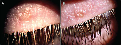 Figure 4. Clinical presentation of a 20-year-old male who has Demodex blepharitis before (A) and after (B) treatment using wipes containing diluted tea tree oil twice daily for one month.