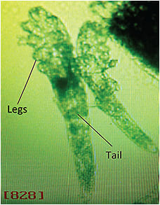 Figure 1. Image of two D. folliculorum viewed laterally under light microscope. The legs and tail of one of the mites are labeled. To view a video of this courtesy of Scott Schachter, OD, Vision Source, Pismo Beach, CA, click here.