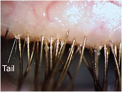 Figure 3. Clinical signs of Demodex blepharitis. This image shows several clinical manifestations: cylindrical dandruff at the base of the lashes, lash loss, and greasy lids. The tail of a Demodex mite can also be seen (labeled).