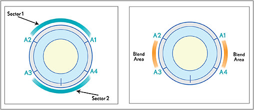 The periphery of the KeraSoft IC lens can be steepened or flattened independently of the base curve. This customizable process is known as Sector Management Control (SMC). Up to two sectors in the periphery can be modified when necessary, such as with post-graft corneas that require flatter base curves but need peripheral steepening. Also, low cones and PMD corneas may require SMC steepening of the inferior sector and possibly flattening of the superior sector. Lens Sector Angles (quadrants) are designated and specified as either STD (Standard), STP (Steep) 1 through 4, or FLT (Flat) 1 through 4 (up to four steps of change are available) (Figure 7). A1 and A2 define the beginning and end of the first sector, A3 and A4 define the beginning and end of the second sector. Blend areas are automatically set once sector angles are defined.