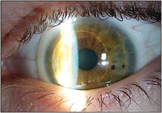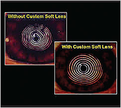 The NovaKone (Alden Optical) lens is a relatively new addition to this category that uses increased thickness as a lens parameter to compensate for corneal irregularity. The central zone of this soft lens can neutralize irregular corneal astigmatism much like a GP lens does due to its significantly increased thickness. It has an advantage, however, in that it can correct residual astigmatism by incorporating astigmatic correction on the front surface of the lens. Rotational stability for the toric application comes from Alden’s Dual Elliptical Stabilization design (Figure 2).