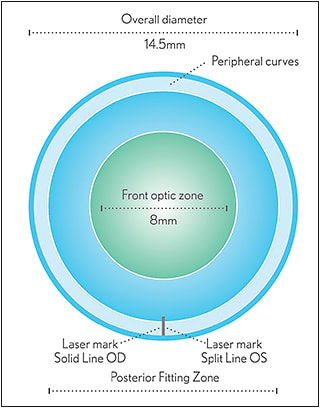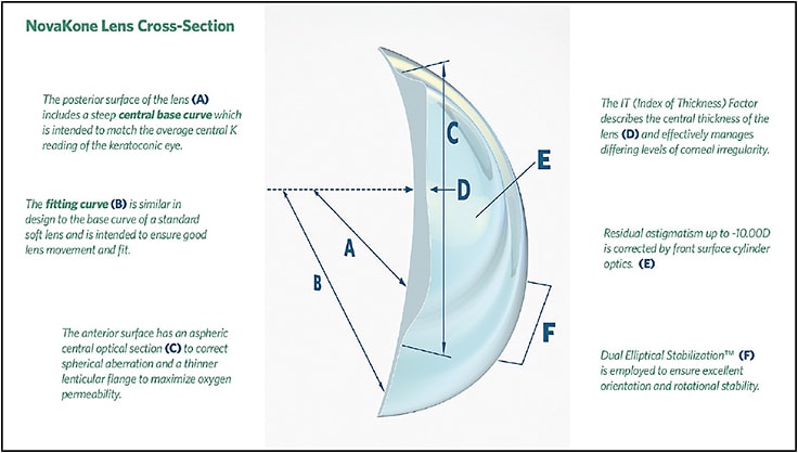 The KeraSoft IC lens was developed in the United Kingdom by UltraVision CLPL and is distributed in the United States through Bausch + Lomb (B+L) and several authorized manufacturing labs (ABB Optical Group, Art Optical, and Metro Optics). As with the NovaKone lens, this lens can be employed for managing keratoconus (all stages), PMD, post-corneal surgery including post-LASIK ectasia, and other irregular astigmatic conditions. (Note: practitioners wishing to fit either the NovaKone lens or the KeraSoft IC lens must be certified through an online certification process.)