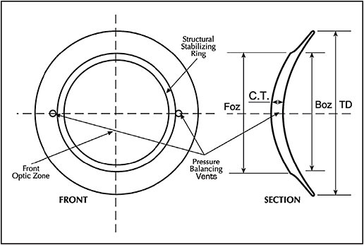 The Soft K lens is double lenticulated to decrease lens mass and increase comfort, and the junctional area between the optic and the carrier is thus structurally stabilized (Figure 1). Located just outside of this structural ring at 3 o’clock and 9 o’clock are two pressure-balancing “vents” or fenestrations that are designed to enhance equilibration and can be used for measuring lens rotation (which then will need to be compensated for when ordering the final toric lens powers). The vents equalize the fluid pressure between the front and back surfaces and allow air bubbles to escape from behind the lens.