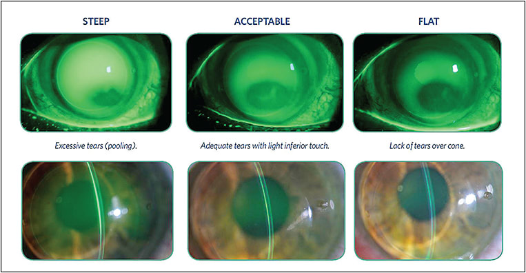 1. Determine the central base curve. Use the supplied initial lens selection table that recommends the base curve/fitting curve combination based on average Ks (or Sim Ks if using topography) for the central 3mm to 4mm zone. This test lens is applied, filled with high-molecular-weight fluorescein, and evaluated to achieve an acceptable lens that demonstrates neither excessive bearing over the cone, nor excessive apical clearance (Figure 4).