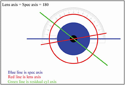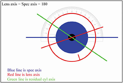 Misalignment and rotation are not the same thing. For example, if a patient’s spectacle prescription is –1.00 –1.75 x 155, and we apply a soft toric with power of –1.00 –1.75 x 160, there will be 5° of axis misalignment, even if there is no rotation. If this lens rotates 5° to the right, the patient is looking through axis 165, which means there is 10° of misalignment, and the patient will have a little more than 0.50DC residual astigmatism. Changing the lens axis to 150 will yield axis 155 after rotation, which is exactly what the patient needs. In other words, don’t stop when you see the lens is rotating only 5°; analyze the axis misalignment carefully to provide optimal vision.