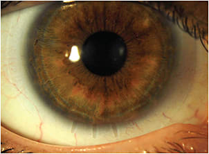 Figure 1. A soft toric contact lens with about 5° left rotation. Note the three toric lens markings on the inferior portion of the lens.