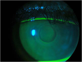 In the first six to eight months after the procedure, the patient complained of vision fluctuation and reported that his vision was worse than it had been before the procedure. At the time of his first visit with us, we observed that both eyes had a circular mark from the procedure. This mark was better observed after fluorescein instillation (Figure 1). The mark probably results when the Keraflex procedure cools the area adjacent to where the microwave pulse is applied. Figure 2 shows his corneal biomicroscopy. His topography was very irregular, although it seemed that there was a significant flattening effect.